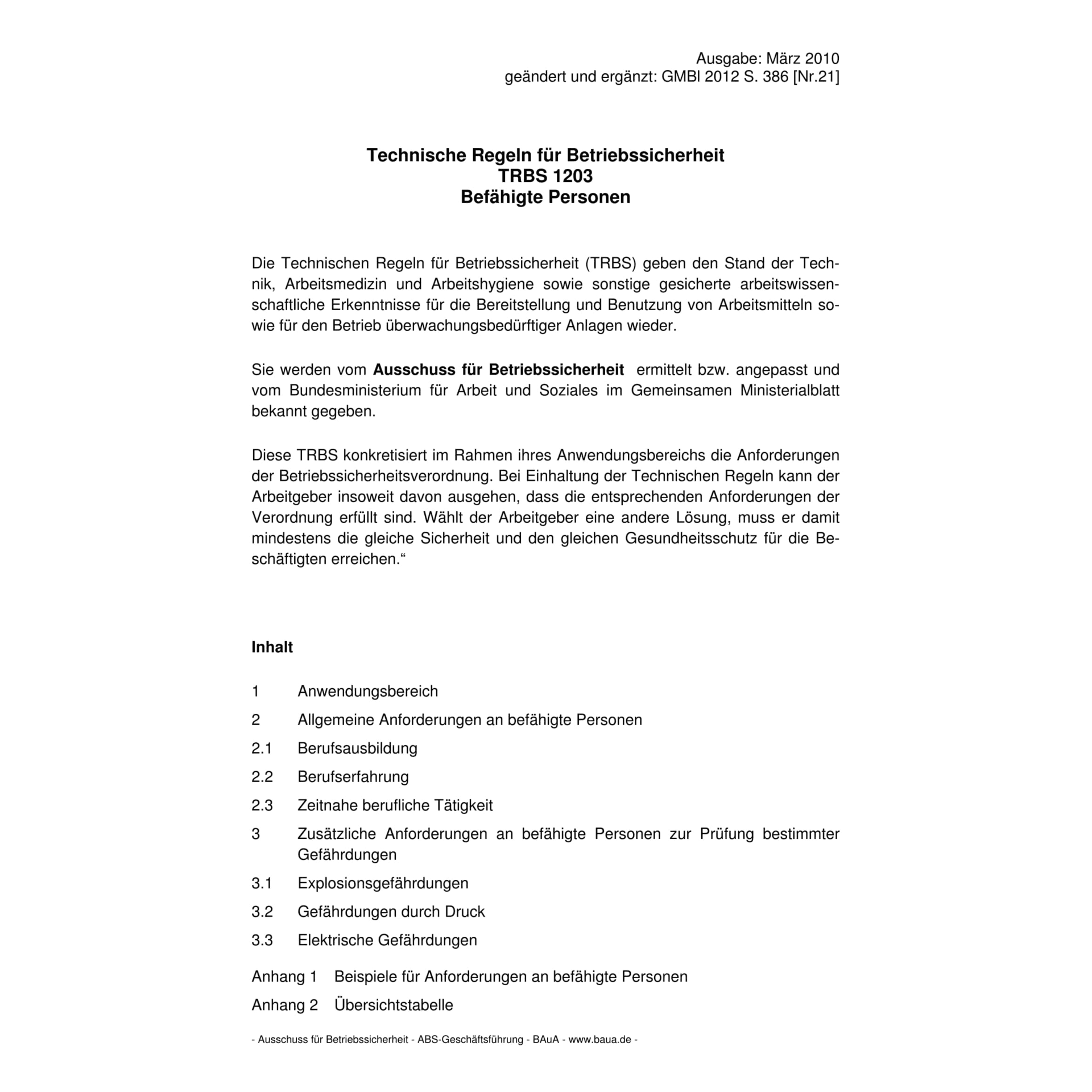 TRBS 1111 - Gefährdungsbeurteilung und sicherheitstechnische Bewertung